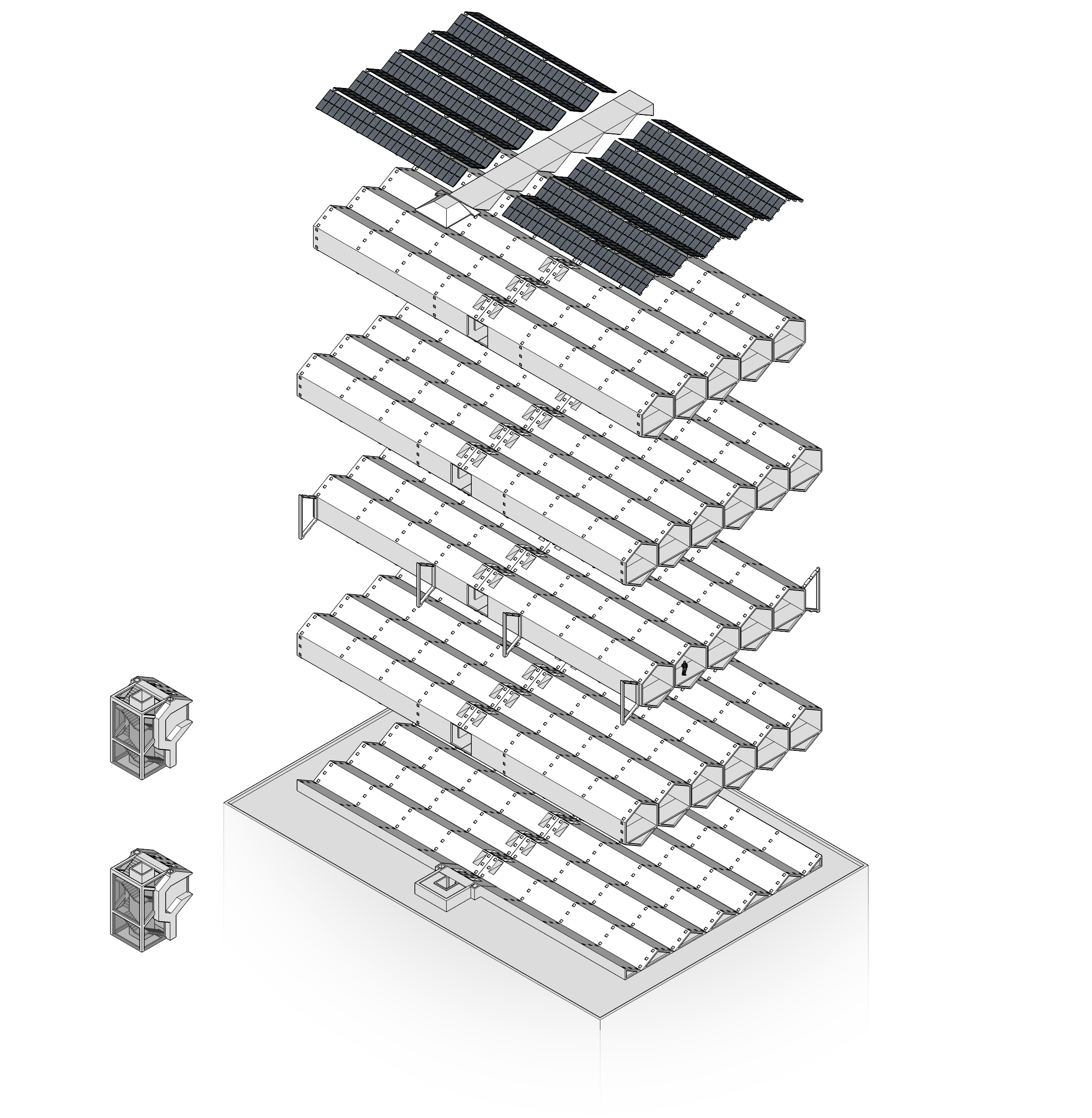 In a world where space is becoming a precious commodity, increased densification of cities will become necessary if we are to maintain a balance between Urban, Agricultural, and Natural environments. However, it is not always practical to demolish older buildings in order to construct taller ones, this is where ‘vertical extensions’ of existing buildings comes into practice. This project was the result of a design reseach course which called for new and innovative approaches to construction around the world. It specifically asked students to develop new ways to renovate and add floors to tall buildings as an alternative to complete demolision and new construction.