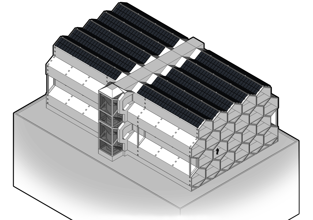 This proposed modular construction system would employ the latest in large scale 3D printing to create a Uni-body or ‘Monocoque’ construction where the ribbing, stud work and external skin are all one continuous piece. This, along with the hexagonal prism shape, would enable superior strength and quick on-site installation of each module. This system would use a 3D printing process that utilises Carbon Fibre, the technology for which has only emerged in that past few years.